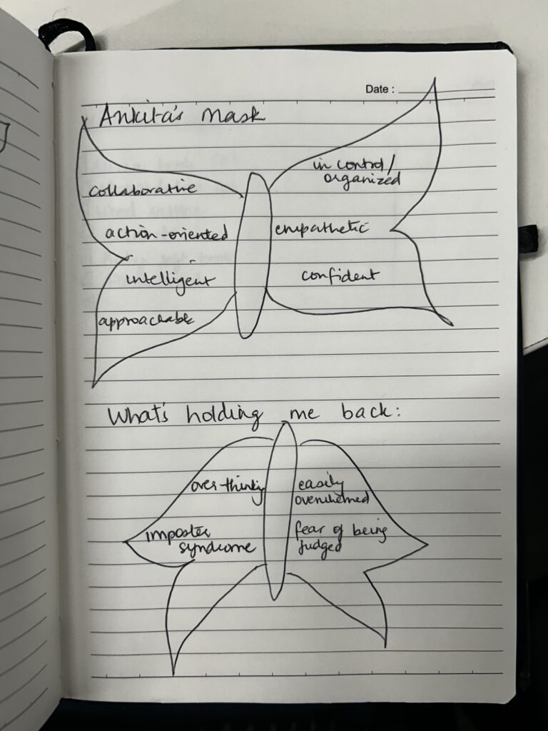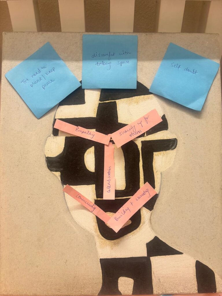 Aarushi Khanna’s mask feels like a quiet tension between doubt and intention. The blue notes linger above with the words: the need to be heard, discomfort with taking space, self-doubt like thoughts that hover, shaping everything but not quite grounded.