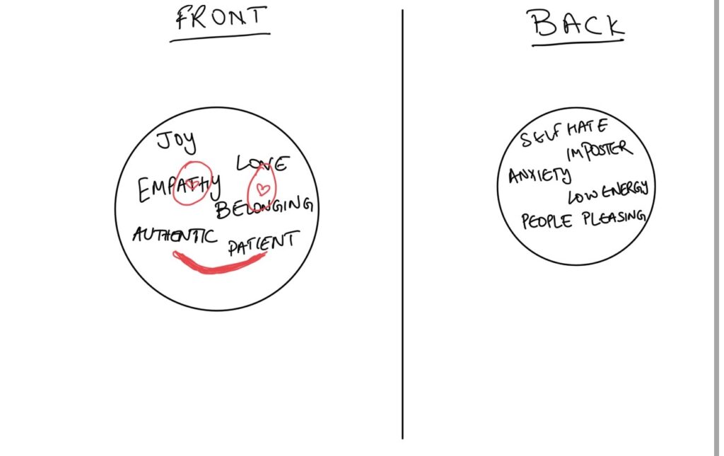 But the back tells a heavier truth; self-hate, imposter, anxiety, low energy, people-pleasing. It reveals the unseen cost of being that light for others.
