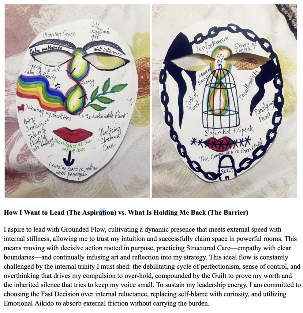 This mask shows two inner worlds in one face. On the left, a sun shines over a sprouting branch, in bright colours with the words hope and action, a space of growth, Energy, and forward movement. On the right, everything turns grey: a single eye, a broken heart, and rain clouds holding the words pressure, fear, and vision; a quieter space of weight, struggle, and uncertainty. Together, they reflect a a woman leading by holding light and heaviness at the same time, still moving between hope and pressure, becoming through both.